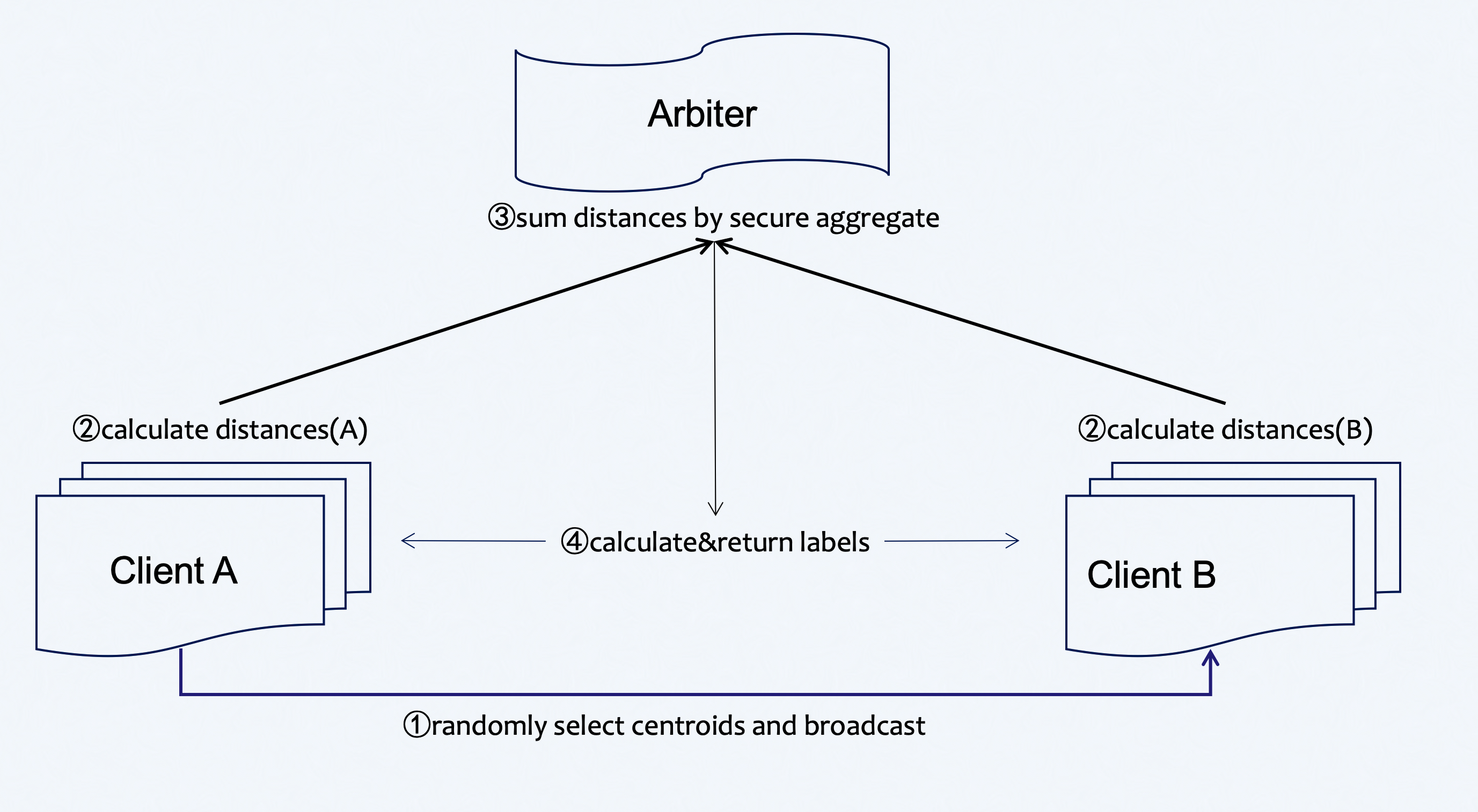 In the training process, party A will choose centroids from samples randomly and send them to party B . Party A and party B then compute the distance to centroids ,which is needed for label assignment. Arbiter aggregates, calculates, and returns back the final label to each sample and repeats this part until the max iter or tolerance meets the criteria.